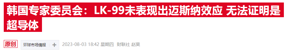 据韩联社下午公布的报道,韩国超导低温学会的专家验证委员会认为,目前没有充分证据证明先前韩国团队声称发现的“LK-99”就是“室温常压超导体”,因为它不具备超导体特征之一的“迈斯纳效应”。