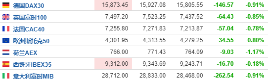正在交易的欧洲股市也多数走低,截至发稿,德国DAX30指数跌0.91%,英国富时100指数跌0.85%,法国CAC40指数跌0.79%。