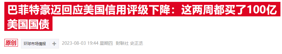 对此,有“股神”之称的沃伦·巴菲特表示,有些事情人们没有必要去担忧,(美国主权信用评级)下降就是其中之一。巴菲特部分同意惠誉的观点,称他也不完全认可拜登政府的所作所为,但这并不足以改变他对美国国债和美元的看法。